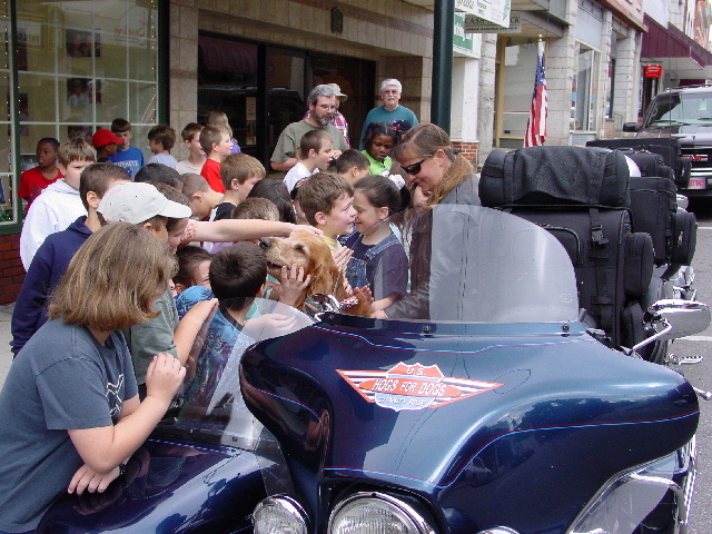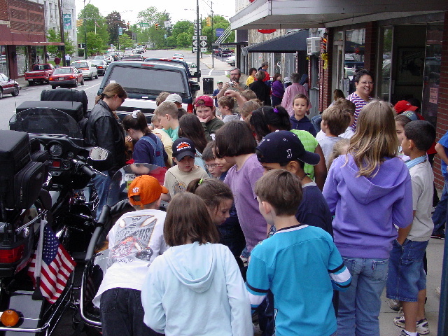 Bailey has already spilled the beans on this part of the story, so I won't rehash too much of it. But, we had screaming little people everywhere, swarming like flies around Max & Bailey in their sidecars (pictures 04-05). Finally, with more than a little coaxing from their teachers, the students were dragged back to the sidewalks and allowed us to make our way to the Snappy Lunch - and then they regrouped for a second attack. Actually, they were very gracious and interested in our ride. We passed out photos and spoke to the teachers about our ride before leaving to take a walk through Mayberry before lunch.