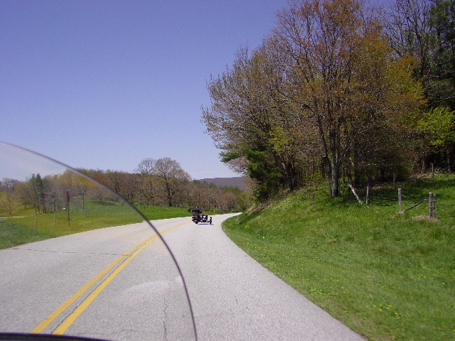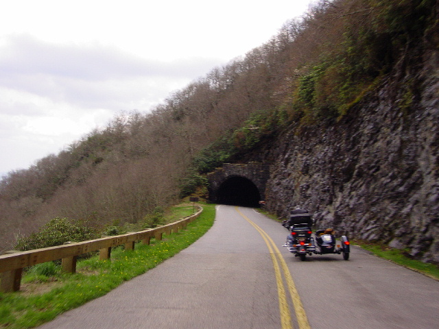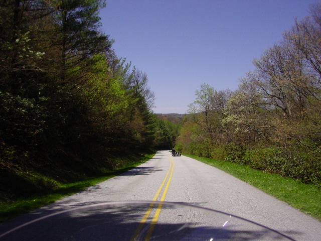Imagine rolling hills and trees with their new spring foliage lining the long sweeping curves of the Blue Ridge Parkway. If you can't imagine, go look at a few of our pictures and then come back (pictures 17-23). Now that you have that image, insert one Kamikaze Wild Turkey lying in wait on the right side of the road. We saw him waiting for us to approach. And, just as Janet got close enough, he took his first step into the road and grinned at her, daring her to keep it coming. Janet kept coming and that turkey took a few more steps, now in the middle of the lane and still staring Janet down. It was a Mexican Stand-off of Butterball proportions. I think I saw Bailey put both paws over his goggles so he didn't have to watch.