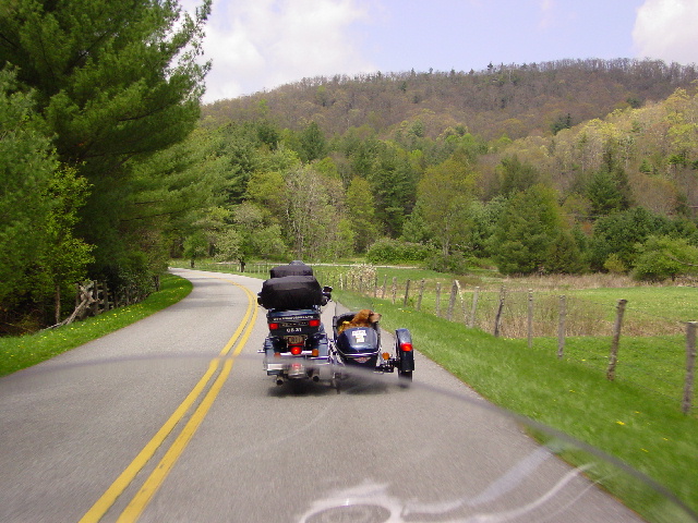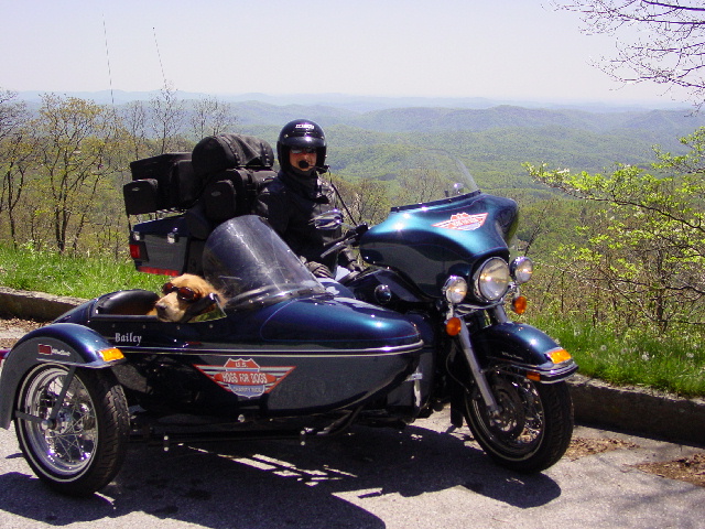 Then came Snappy Lunch - well, sort of. This is a working charity ride, so we first had to put the dogs back in their sidecars so we could go into the restaurant. That, of course, created quite a stir ('stir' is another one of those southern words) with the local folk. So, before you knew it, we had answered all their questions, spent 45 minutes telling stories about Max & Bailey's ride, collected several donations and sold more t-shirts. Okay, so THEN we had our fried pork chop sandwiches, giving us the fuel for the ride along the Blue Ridge Parkway over the mountain to Deep Gap.