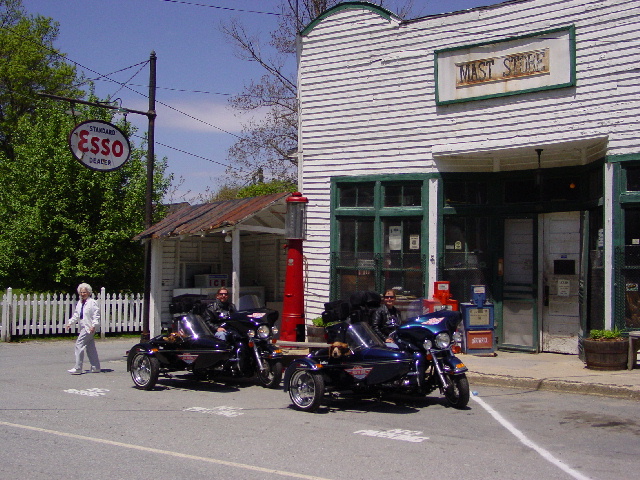 Being a Sunday, it's not hard to imagine that we had the normal Sunday drivers. They laughed, smiled and casually clicked photographs of the dogs riding in their sidecars. I have this mental image that all those photos will look like some Norman Rockwell painting where the father is leaned forward, gripping the steering wheel with a determined look on his face, racing to his destination. But we only had three hours to get to Mayberry! So, if you took one of those photos, maybe it will be worth something like the Norman Rockwell paintings one day. The important thing is that we arrived with only a few drops of rain finding their way down the backs of our shirts.