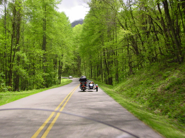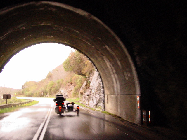 Somewhere along our route, while trying to catch our breath from all the breathtaking views (pictures 08-12), one black cloud began to form. I didn't see if form. Janet didn't see it form. And if Max & Bailey saw it, they didn't say a word. But form it did, and just as we were crossing the highest point on this route, the temperature started to drop - quickly. Then, DANG-NABBIT (another southern term that I learned), it started to sleet! You're probably laughing at home, but it was like watching a Chinese fire drill as we clumsily hopped into our rain gear and put the rain covers over the sidecars.