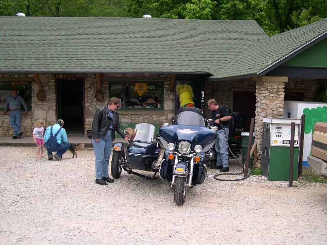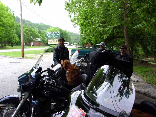 With an early start the following morning, Den and Debbie, escorted the Hogs For Dogs crew from Jordan to Fayetteville, Arkansas just on the border of Oklahoma. I'm not sure of the names of all the roads they took us on, but the views across the Ozark Mountains were spectacular. One of our stops was at an overlook for the Grand Canyon of Arkansas, a deep tree-filled depression that went on for as far as the eyes could see. By the end of the day, our butts were sore and our arms tired from all the twists and turns. Riding with a sidecar is much like riding an off-balance ATV four-wheeler, making the turns very difficult but worth all the effort.