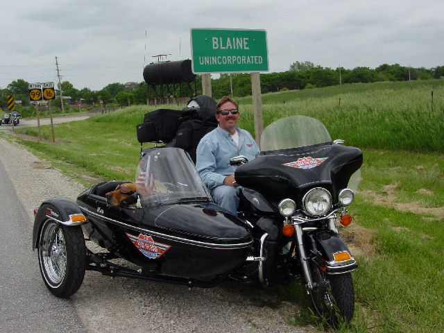 But the morning came sunny and clear, making our ride to Washington, Kansas a very pleasant one. We took a slight detour on our way so that I could take my photo in the Kansas town that bears my name: Blaine, Kansas. We also enjoyed a rest stop at a small roadside park where Max & Bailey had their first encounter with cows. Although the cows paid him no mind, Bailey was insistent in showing them that he was INDEED the bigger dog. If only I'd had a video camera to record it all. Though, I don't know that the video would have been that good because we were laughing uncontrollably at the sight. (pictures 02-04)
