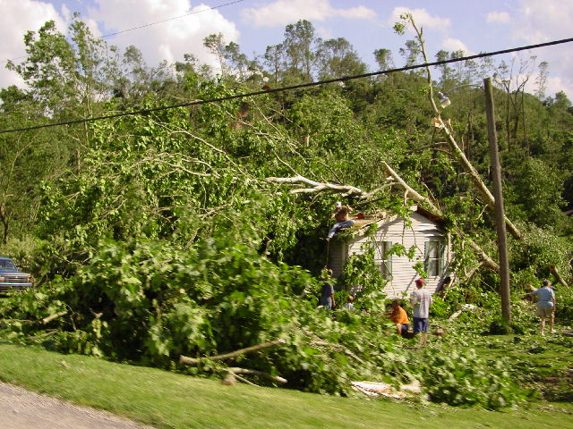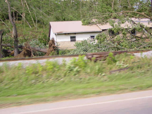 What we didn't know until ten minutes later was that the town, whose citizens had just donated $50, had lost many of their homes in tornadoes just the night before (picture 15-17). We drove through one community where the homes had been built at the base of a tree-covered hill. The hill and the trees rose several hundred feet above the homes. But after the tornadoes, many homes had been blown off their foundations with the debris thrown up the hill and into the trees. Again, our hearts broke.