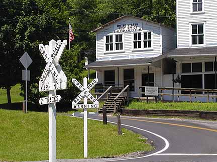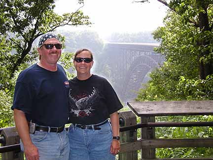 We got the obligatory pictures of the overlook viewing this impressive bridge (the longest single span east of the Big Muddy, and tall enough to fit the Washington Monument and two Statues of Liberty on top of one another). This is the bridge they close off one day each October and allow BASE jumpers to jump off and parachute to the bottom. It's a huge event up here on "Bridge Day".