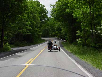 Half way up the other side of the gorge, we stopped at a small waterfall for pictures and were waved over by a couple from Greensboro, NC who wanted to see the dogs in the sidecars. All good people, nice conversations, and profitable stops, but I began to worry about keeping to any schedule at this pace!